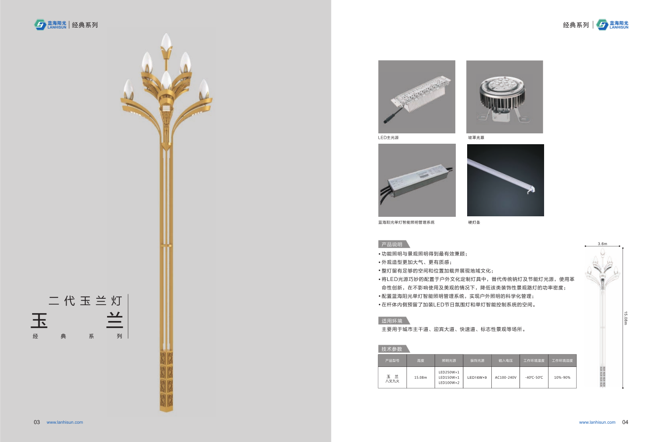 1、高度為6-16米; 2、花葉光源為4組LED光源,色溫2500-6500K,燈罩光源為9只LED裝飾光源,每個光源功率為30-60W; 3、LED驅動電源壽命可達五年; 4、整體熱鍍鋅噴塑,保證燈桿15年不生銹; 5、可以根據使用地區的地域文化、產業特點等進行文化定制;