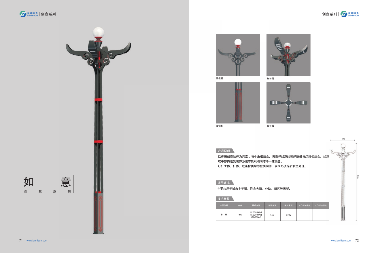 1、高度為6-16米; 2、花葉光源為4組LED光源,色溫2500-6500K,上部燈罩光源為LED裝飾光源,每個光源功率為30-60W; 3、LED驅(qū)動電源壽命可達(dá)五年; 4、整體熱鍍鋅噴塑,保證燈桿15年不生銹; 5、可以根據(jù)使用地區(qū)的地域文化、產(chǎn)業(yè)特點(diǎn)等進(jìn)行文化定制;